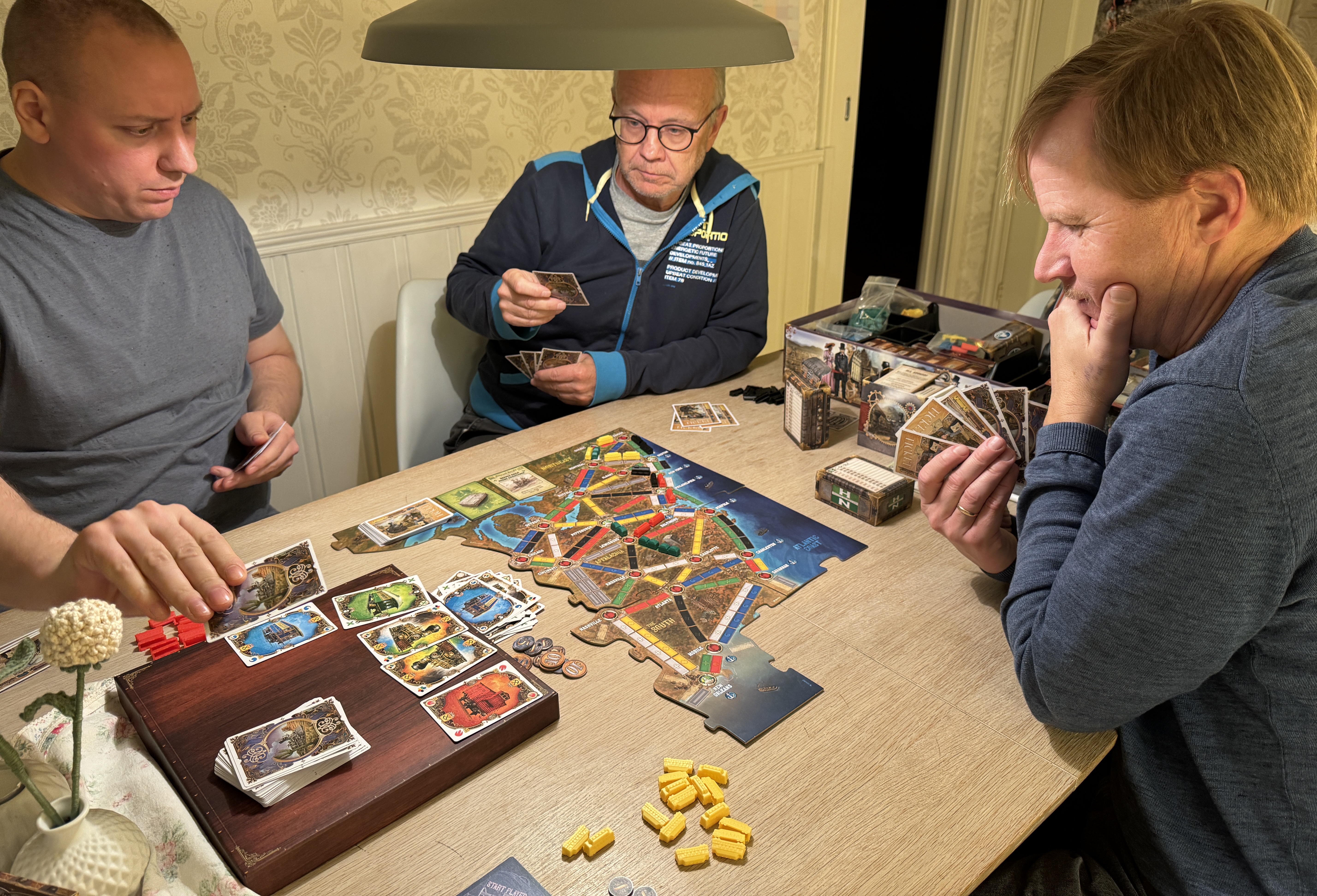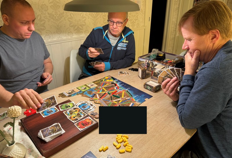 Men, vi er ikke harde fans av Ticket to Ride i PG. Vi spiller det gjerne med nye spillere, men ikke oss imellom. Og det at vi har dedikert 12 kvelder til dette spillet – og faktisk gledet oss til det – sier ekstremt mye, egentlig.