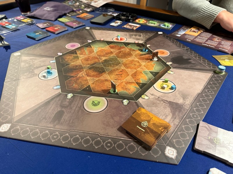 Graham forklarte reglene på veldig rask engelsk, og for undertegnede var det ikke enkelt å få med seg hvordan det hele hang sammen, jeg er heldigvis ikke alene. Men etter noen runder og ekstra sjekk i reglene var det enkelt: 3 handlinger: flytt, aktiver kort, aktiver lokasjon. Alle 3 kan gjøres, men kun én gang hver, bare du bestemmer rekkefølgen. Og bare det tok litt tid før var helt på plass, som ble tydelig ettersom nye lokasjoner og kort kom ut hvis regel ikke ga helt mening slik vi spilte det.