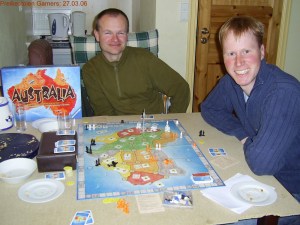 Så etter litt taktisk drøfting og drømming om å stå på Essenmessa og selge spillet sitt, (noe som er meget sannsynlig, skal bare tegne blyantstrekene litt rettere!), så tok vi turen til ett skikkelig Spiele des Jahres, nemlig årets spill i Amerika 2006: Australia.