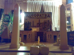 De på nabobordet var knapt halvveis i sitt spill, så hvorfor ikke ta en hovedrett til. Cleopatra og the Society of arts ble valgt. Utrolig vakkert spill, og enkelt ala ticket to ride. Her gjalt det å sikre seg penger for byggverk, samt å ikke få for mye korrupsjon i pyramiden sin. Knut gikk hardt ut på korrupsjon, og ledet godt på å bli spist av krokodillene, mens Sveinmain halet innpå. Det ble 2 ofringer til Sorbel, og noen var for gavmilde, mens andre (Knut) var for gnien, og måtte derfor bli spist av Cleopatras krokodiller.