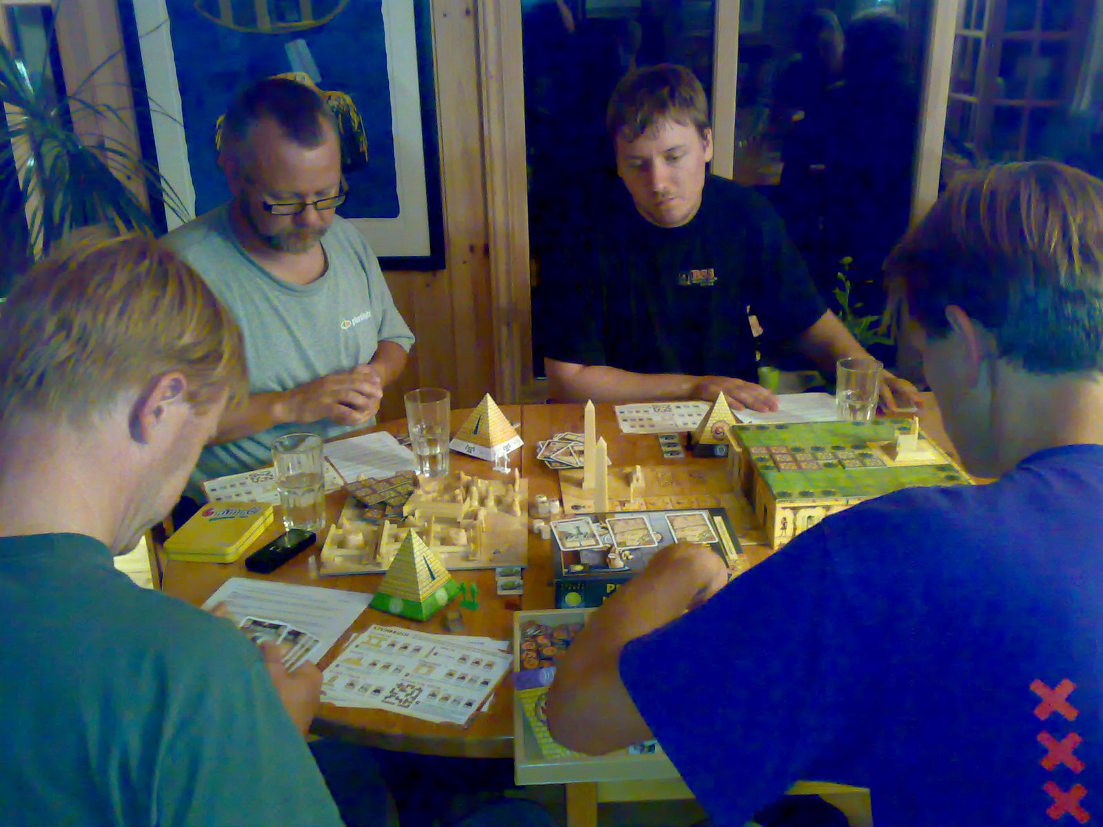 De på nabobordet var knapt halvveis i sitt spill, så hvorfor ikke ta en hovedrett til. Cleopatra og the Society of arts ble valgt. Utrolig vakkert spill, og enkelt ala ticket to ride. Her gjalt det å sikre seg penger for byggverk, samt å ikke få for mye korrupsjon i pyramiden sin. Knut gikk hardt ut på korrupsjon, og ledet godt på å bli spist av krokodillene, mens Sveinmain halet innpå. Det ble 2 ofringer til Sorbel, og noen var for gavmilde, mens andre (Knut) var for gnien, og måtte derfor bli spist av Cleopatras krokodiller.