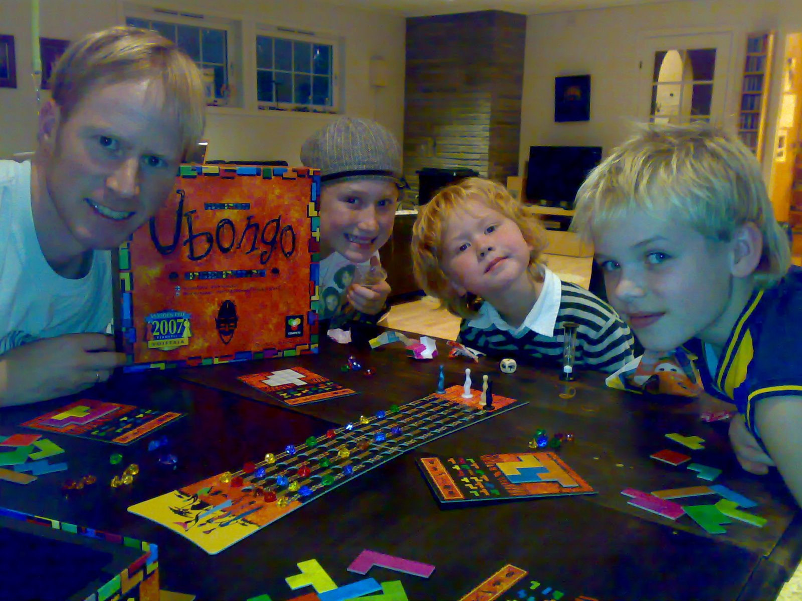 Hva gjør en en fredag når en har masse tid og det regner ute? Spiller brettspill så klart. Denne gangen skulle Black ant senior og junior, spille med Sveinmain Senior og dattra, samt junior som kontrollør. Først ute på menyen sto en nykommer fra tyskland, Ubongo. Sveinmain fryktet at spillet lignet på Ligretto, mens Black ant hadde SET i tankene da vi oppdaget timeglasset i spillet. Og etter en kjapp prøverunde bars det i gang. Alle hadde nå 43 sekunder til å ta opp de riktige brikkene, få brikkene riktig plassert på brettet, flytte brikken sin, og ta to diamanter helst i den fargen du samler på. Vi spilte den letteste varianten, og det ble litt forskjell på voksne og barn, så neste gang spiller nok de voksne med vanskeliggrad 2, dvs. 4 brikker, istedet for 3. Men barna likte det, selv om det skilte litt. Og en vanlig Ubongorunde kan du se her: