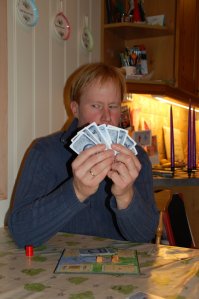 Kort, et lite brett, noen brikker, men likevel temmelige avanserte regler til å være et så lite auksjonsspill. Her gjaldt det å by på varer, inkludert sine egne, selge de enten ved å få penger, eller seierspoeng. Bunkre opp noen kort til neste runde og på an igjen. Torleiv tok en tidlig ledelse da han fikk full pott på seierspoeng i de 2 første rundene, Sveinmain fulgte hakk i hel selv om han av og til som dere ser av det ene bildet fikk ANALYSE PARALYSE. Hollender og Peter fulgte ikke langt bak i motsetning til Black ant som lå meget langt bak. Etter 5 meget tette runder hvor Torleiv på slutten hadde fått litt likviditetsproblemer klarte Sveinmain etter slutt-tellingen å få høyere brikkestabel enn Torleiv og var sikker på at han hadde vunnet. Men, Peter som hadde lagt brikkene sine flatt istedet for å stable dem kom pluteselig med en såpass høy stabel at han vant til Sveinmains store ergrelse, og de andres jubel selvfølgelig. Surt, men Sveinmain gikk på v