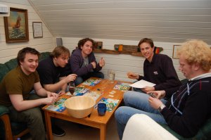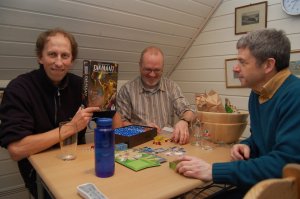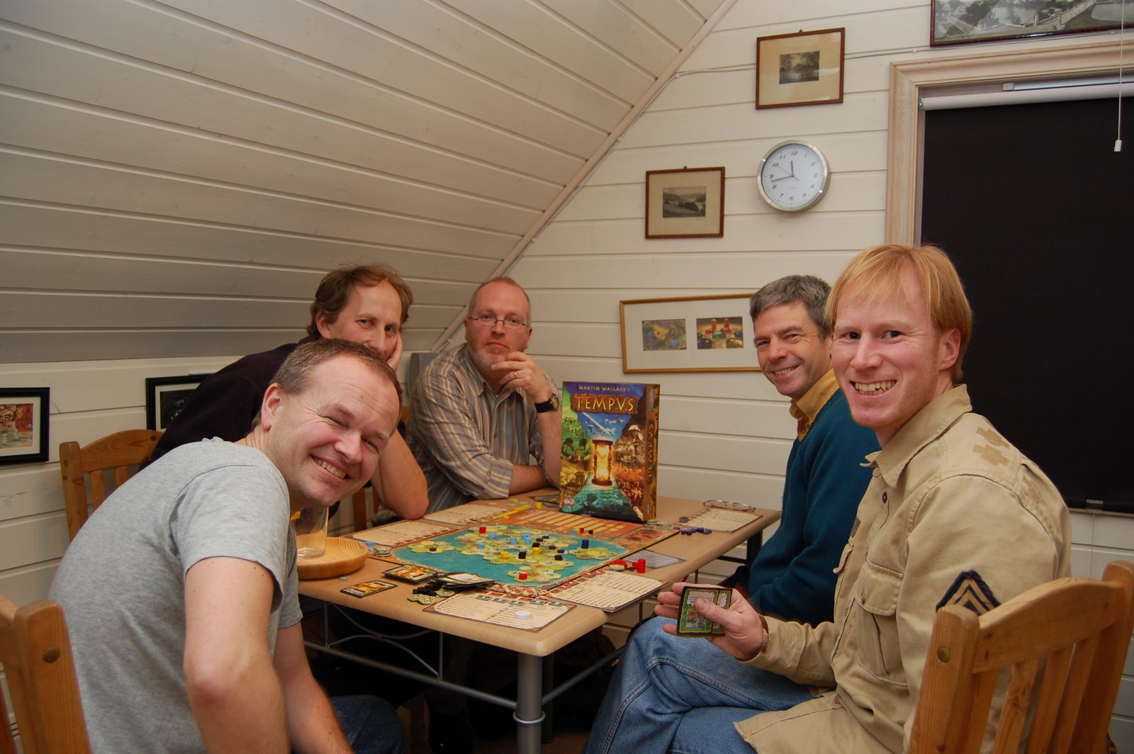 Med så mange tilstede skjedde noe unikt i allefall i PG målestokk. Vi måtte rett og slett ta en presentasjonsrunde. I tillegg avholdt kasserer Black ant årsmøtet i PG etter gjeldende regler i Hyperion. Styret ble valgt videre ved aklamasjon. Fornøyde delte vi oss opp på to bord. 5 på hver. Tempus ble valgt på det ene, og Puerto Rico på det andre. Litt ut i spillet dukket plutselig Innante opp, og KLUBBREKORDEN var et faktum. Men da var det fullt på alle bord, så Innante måtte velge mellom enten å se på, eller å spille Twister med seg selv på gulvet, da det ikke var mere bordplass i herberget. Overraskende nok valgte han det første.