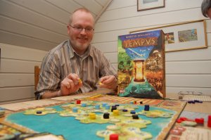 e var vi i gang. Alle bygde plantasjer, unntatt Vegard som satset på rolig oppbygging og ikke minst kolonister. Han og Arild tok hospitium i den første runden. Hollender valgte hacienda som gav ham en ekstra plantasje i settler-fasen. Med stadig flere maisplantasjer (etter hvert 6 stykker) genererte Hollender mange poeng i kapteinsfasen. Arild fulgte hakk i hæl med sine maisplantasjer. Torleiv og Pift hadde indigo og sukker, mens Vegard bygde lagsomt opp en lønnsom kaffeindustri som gav ham god inntekt. Arild og Vegard fikk de fleste steinbrudd, slik at resten måtte betale ekstra for bygningene. Spillet fløt og vi hadde kommet halvveis da Tempus-riddere hadde fullført sin første runde. Vegard, Arild og Hollender fikk stadig flere poeng for henholdsvis bygninger, bygninger og seierspoeng, og hovedsakelig seierspoeng. Pift og Torleiv slet med å finne en god kombinasjon av bygninger, produksjon, leveringer og inntekt. Pift sluttet spillet da de siste poengsbrikker ble tatt i kapteisfasenb. Både Vegard (som spiller jevnt