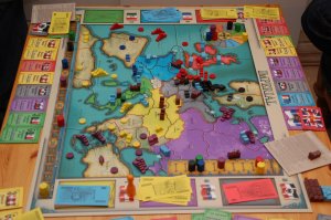 styreretten der. Peter rystet opp Italia og erobret et stort området. Litt senere overtok Peter Tyskland fra Hollender, som satt igjen uten styrerettigheter. Peter og Black Ant hadde tre land hver i to runder. Likevel får man noe penger uten hovedandeler og Hollender kunne sikre majoriteten i Russland igjen. Flaggene (som markerte landenes hovedinvestor) endret eier flere ganger. Noen runder senere hadde Black Ant kun Frankrike med bare to fabrikker og nesten ingen tropper igjen. Peter hadde med Tyskland, Italia og Østerrike-Ungarn en god akse