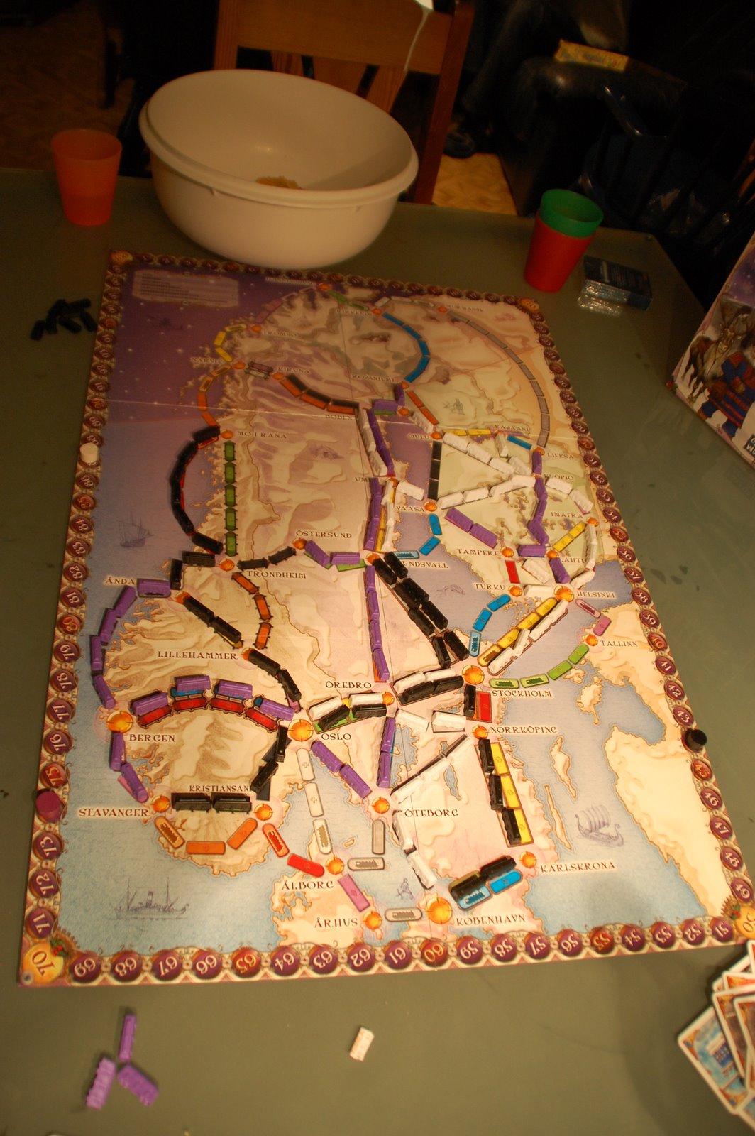 Vegard kom overraskende seint, og enda senere kom Peter. Det gav oss det fantastiske tallet 6! PG-koden. Denne gangen skulle den knekkes på 2 bord. Sveinmain sprettet plasten på Ticket to Ride Nordic, og etter en kjapp regelgjennomgang tok vi fatt på oppgaven