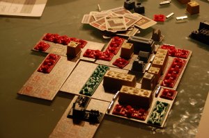 Hollender hadde tatt med seg Morgenland eller Alladin’s dragons som det heter på engelsk. Dette er et taktisk auksjonsspill hvor man byr hemmelig på skatter, tjenester og artefacts. Materialet og brettet så inviterende ut og med noe fortrylling i øynene startet spillerne som eventyrere i den arabiske verden. Først måtte vi samle skatter som man betaler artefacts med. Vegard hadde lagt inn samme bud som Hollender to ganger, men sikret artefacts siden han var startspiller. Kampen hadde startet på alvor, for den som samler mest artefacts vinner spillet. Black Ant