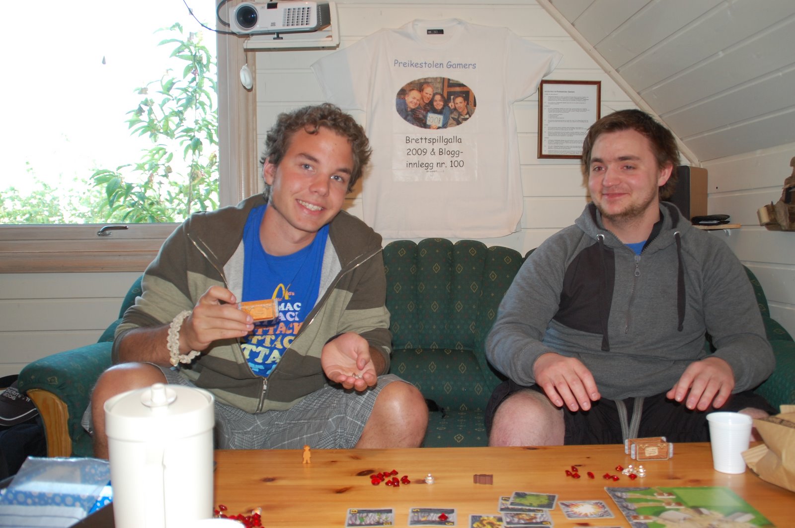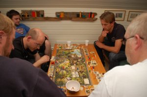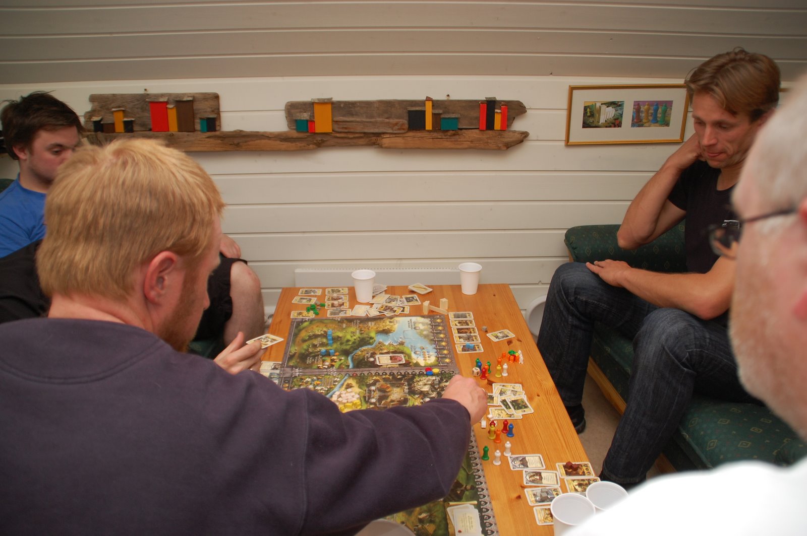 jennomgang av reglene, så var alle klare. Det ble noen harde runder hvor det gjaldt å sikre seg råstoffer som igjen gir seierspoeng. Men en må også passe på pengene sine, for hvis ikke vil en slite. Første skulle en plassere menn for å få ressurser, og dette ble mye kniving om begrensede ressurser. Utvidelsen hadde heldigvis tatt hensyn til dette og ordnet slik at en kunne plassere ut menn og få seierspoeng direkte. Dette var noe Hollender tidlig benyttet seg av. Når han i tillegg satset på seierspoeng tidlig også for sine byggmestere tok han en tidlig ledelse. Peter tok også ledelsen i spillet, men det var på Penger. Han benyttet den nye havnene til å selge varer, for så å kjøpe de billigere på markedet i samme omgang. Hvorvidt dette lønte seg kan dere se på resultatet. Det var mye å ta hensyn til underveis, så hver spiller fikk i gjennomsnitt 5 minu