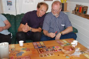 oeng i Priori og på tilleggsbrettet og stormet av gårde. Vegard fulgte ham, mens Black Ant valge å spare 5 varer til den neste runde. Mark og Trond brukte skog og sand til poeng, men fikk ikke den beste uttellingen for det. Slik fortsatte spillet: Hollender (som ikke fikk tak i nye arbeiderskort) og Vegard satset på raske poeng, Black Ant fikk langsomt men sikker tak i gode arbeiderskort og bygget opp økonomimotoren, mens Mark og Trond slet litt med å finne sammenhengende kombinasjoner (varer og kort). Likevel hadde alle forstått hvilke byggmesterplasser som var mest lukrative i den aktuelle runden, slik at ingen fikk noe lett. Black Ant kjøpte en del poeng og kom sterk tilbake. Hvor andre mistet ett arbeiderskort, hadde Black Ant både beskyttelse fra biskopen og et fordelskort som gav mulighet til å ha 6 arbeiderskort. Hollender hadde kun stein som han kunne få poeng for, men lånte glassblåseren til Black Ant (minus 1 i kapasitet) og fikk så også tre poeng. Birger hadde kommet og støttet Trond som kom så nærmere Mark.