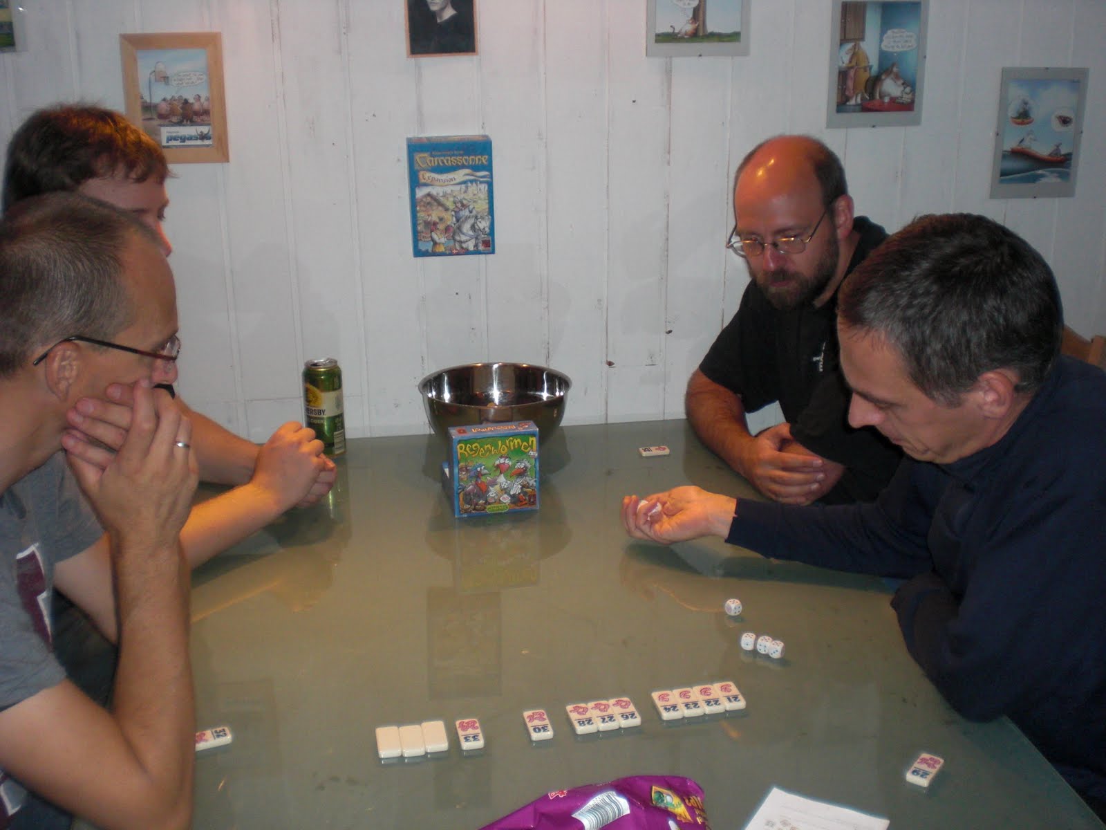 Grotten ble fullt av ivrige spillere som fant raskt veien til kveldens første spill: pickomino. Alle startet med høye brikker (30+) etter bare en runde, men som så ofte i pickomino hadde de fleste mistet sine dyrebare brikker. Mye sukking når brikker ble frastjålet eller mistet. Hollender vant med 10 poeng.