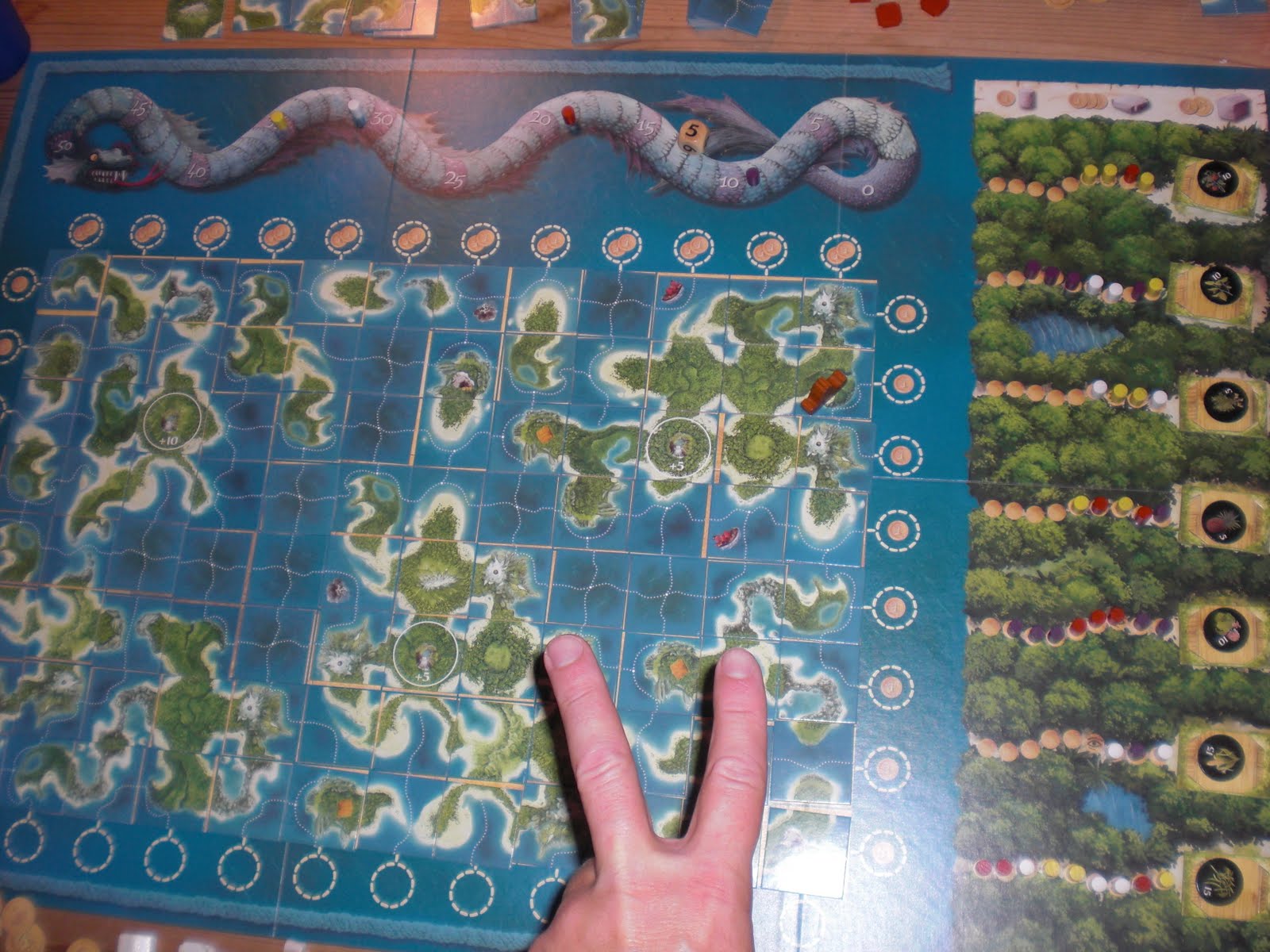 ste å utnytte å sette ut sine store bygg rett før øya ble fullført som gjorde at de kunne brukes igjen og igjen. Sven kom seg til 10+ øya og Aart hev seg på. Sveinmain hadde mest flaks med spørsmålstegn kortene og fikk sette ut speidere i hyttene gratis. Sven var banken for oss alle da han hver runde måtte tilføre kapital til spillet som gav oss andre 1 mynt mere enn han selv fikk noe som ble hans bane. Peter lå i en oppskriftsmessig ledelse da spillet nærmet seg slutten. Sveinmain fikk satt en superbrikke på øy-byggverket sitt i øst, og det hindret mange i å få noen som helt innflytelse der og han innkasserte en god slump poeng nesten alene. Dette gav han en knapp ledelse før hyttepoengene skulle avsløres. Sveinmain høstet der også, så dermed kunne han slippe en litt for stor jubel løs!
