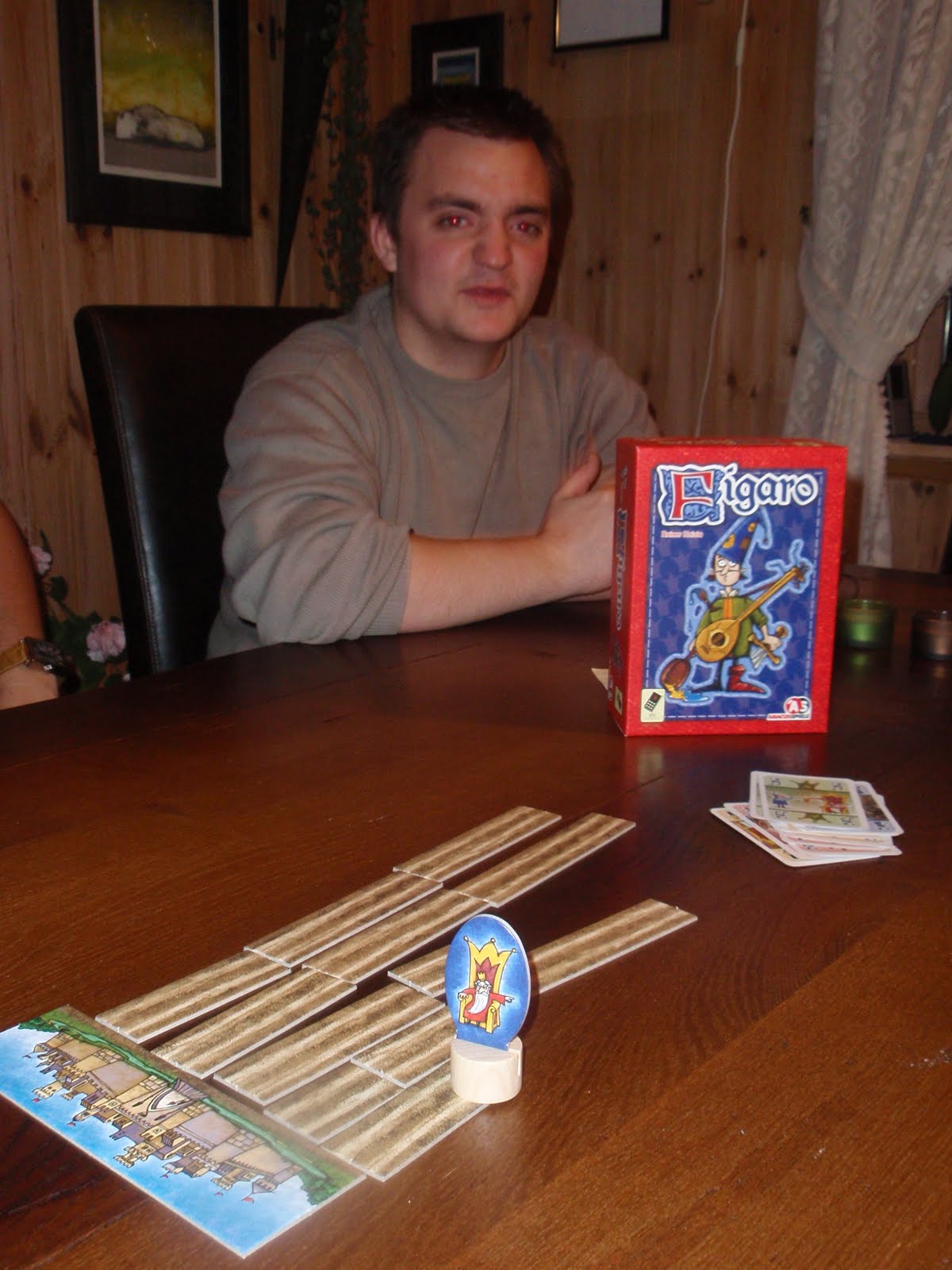 Desserten denne kvelden ble Figaro av selveste Reiner Knizia. Her gjelder det å spille kort på de andre spillerne så de må trekke inn før deg. Kortene har poeng fra 1 til 3(kun en treer pr. farge) i 5 forskjellige farger. Når en spiller har fått 6 poeng må han trekke inn alle kortene. 4 veibrikker ligger klar i hver runde, og taperen tar den lengste, mens vinneren slipper å trekke. Etter 3 runder er det den som har kortest vei til kongen som vinner spillet. Og det kan også nevnes at vinneren i siste runde får bytte ut sin lengste brikke mot den korteste. Spillet er enormt stemningsskapende, og en kan fort sabotere for en spiller hvis en ønsker dette. Sveinmain klarte også denne gangen og snakke seg til desidert flest kort, mens Pift spilte klokt og taktisk. Roald var imponert over hva en kunne få ut av en kortstokk og noen brikker, og alle koste seg med desserten.