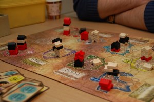 ukjente spillet denne høsten. Regelforklaringen gikk fort og forståelig. Målet i spillet er å bygge høyhus i italienske byer i middelalderen. Hver by har plass til to hus, slik kampen om majoriteten i begge er stor. Ved å spille ut kort, kan man bygge en eller to etasjer. Hver by tillater et maksimum antall husdeler, slik at det blir telling når byens kapasitet er nådd. På slutten av spillet kan man få poeng for utspilte kort med borgere på. Black Ant fikk god uttelling for sin byggevirk