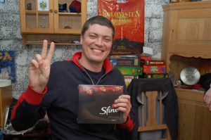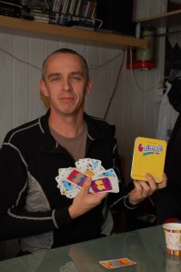 og han fikk spille på lag med jubilanten. Det ble satt en god stemning for kvelden og det var meget uforutsigbart hvem som skulle ta inn kort. Black ant sto for logistikken, og som vanlig for en del inntrekk men mye færre enn vanlig til han å være, og ledet sogar etter 1. runde sammen med Aart og Peter. I runde 2 var det om å gjøre å unngå 10ende plassen. Greit med 5 og sisteplass men 10ende det ville noen aller nødigst være, så det ble tett i bunn, og også tett i toppen. Aart klarte å ri stormen av og vant, mens Hollender ble den 1. og kanskje eneste som får 10 ende plass i 6nimmt gjennom tidene.