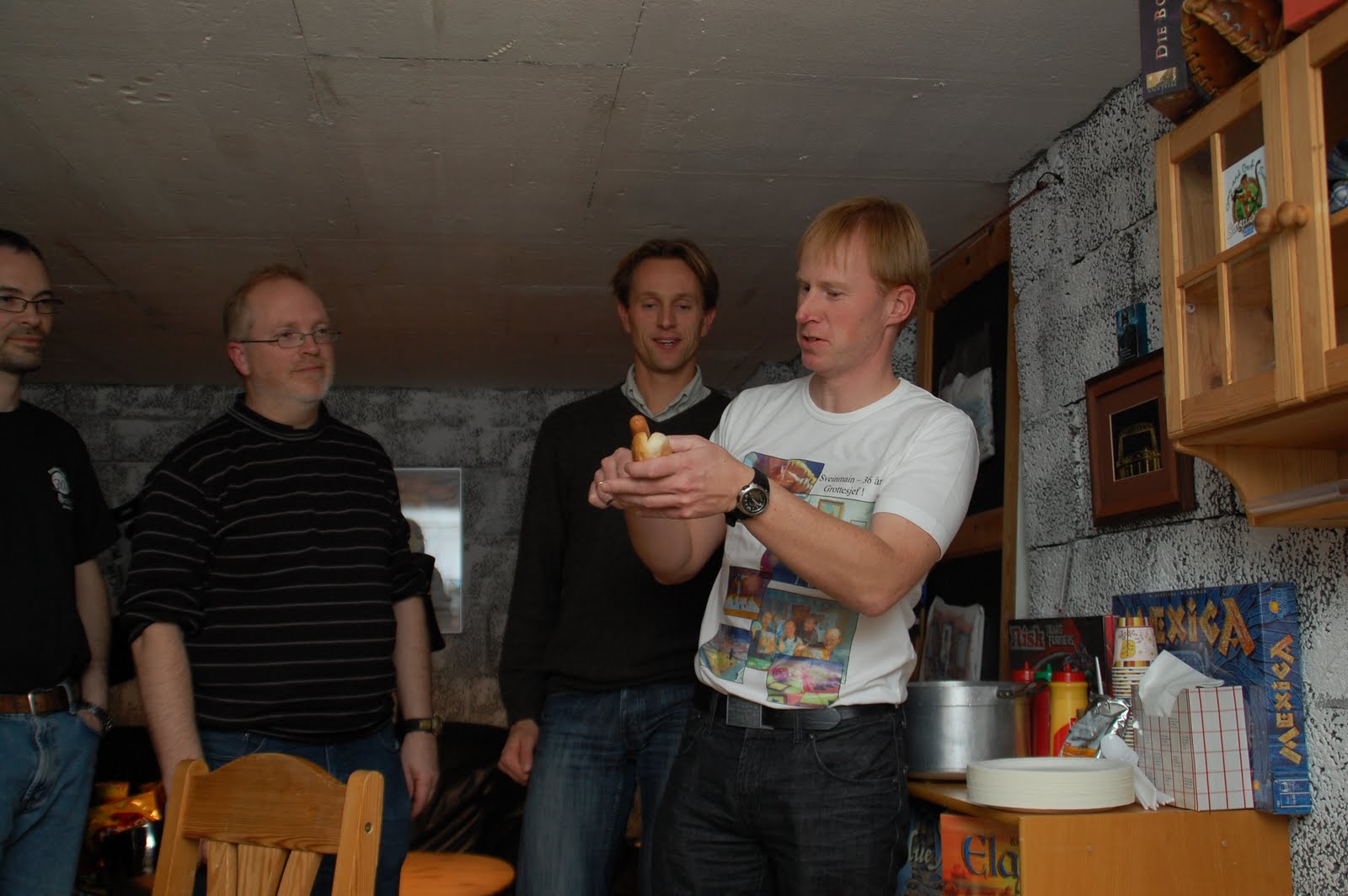 Det ble så bankett, med PGs lengste pølsekø som strakte seg på tvers gjennom lokalet. Og etter noen taler og et par sanger så ble det deling i 2 bord. Sven, som hadde kommet