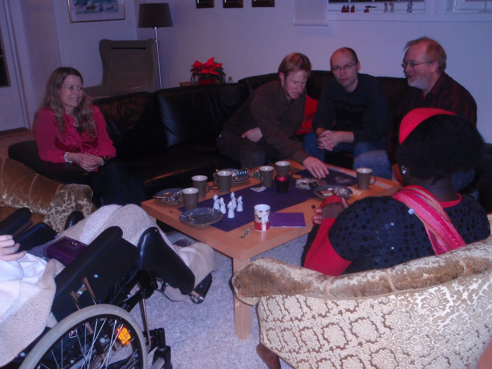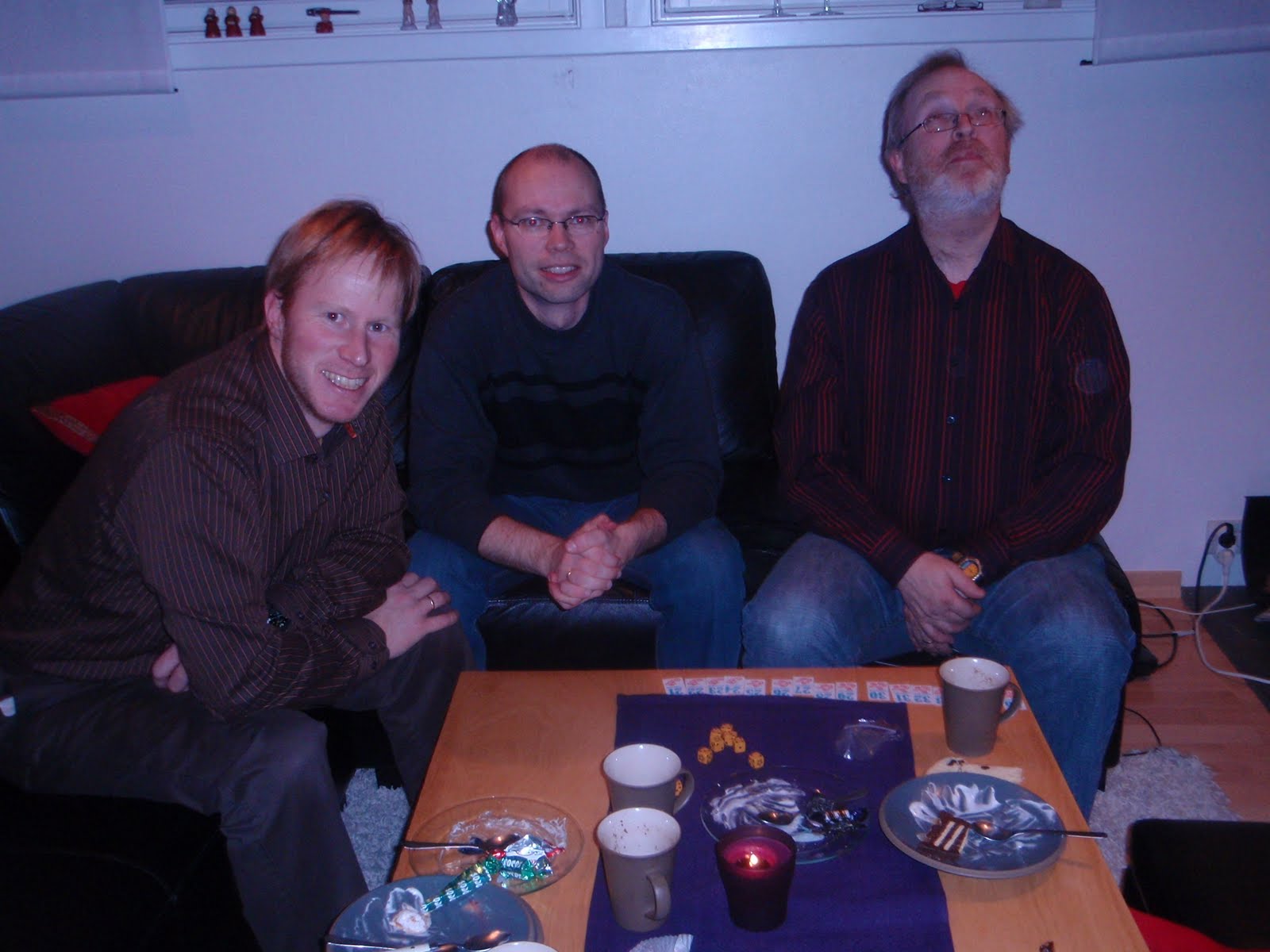 vi ble oppdaget, at damene som etterhvert har blitt allergisk mot brettspill, lot oss få lov å fullføre. Det ble Peter som hadde mest gullhår i rumpa denne kvelden, og han klarte å kaste 4×4 markterninger som åpningskast, noe som må være verdensrekord. Sveinmain slet voldsomt med å klare å nå 20 poeng, og når han klarte det så mistet han brikken rett etterpå. Robert klarte å utfordre Peter, men Peter – med kleptofingrene sine klarte stadig vekk å stjele brikkene hans. Dermed ble det en knusende seier til «Gullhårrompe»Peter. Om det var adventsduken som gjorde utslaget, eller auraen av misfornøyde damer og masende unger, er uvisst. Men som dere ser på bildet fullførte vi det hele med stil.