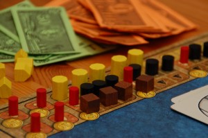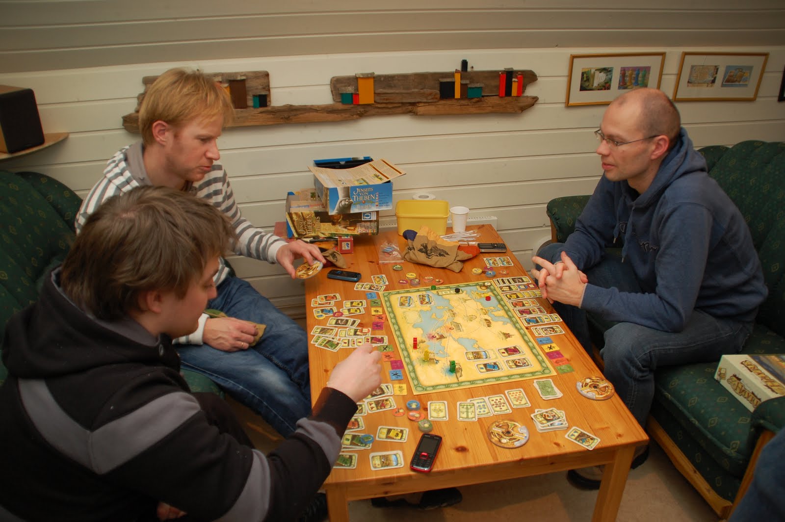 noen hadde hatt en lang dag på jobben denne mandagen og slet med å lære noe nytt, men litt motvillig så ble Sven og Arild med på en runde. Reglene var enkle nok, men likevel litt komplisert. Men etter en runde begynte poenget med spillet å sitte. Her gjelder det å få innflytelse med indianerne sine på engene(Bison) i fjellene (Kalkun) og i elvene(Laks), og det gir igjen mat nok til at en igjen ka