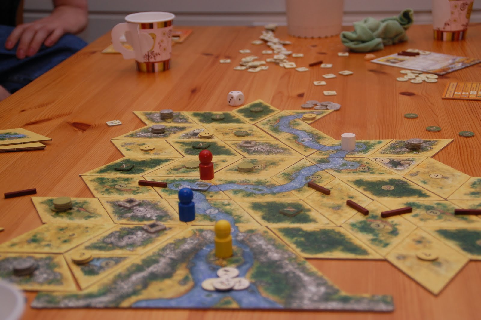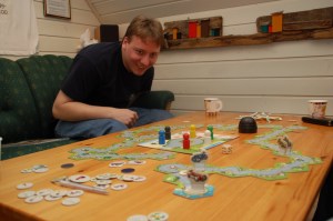tt, med like mange i hver farge. Så føres disse Clanene sammen og når de står samlet uten folk rundt seg danner de en by, og det blir poengtelling. Slik går spillet 12 poengtellinger til ende. Og de clanene som er representert i byen får poeng + evt tilleggspoeng hvis de står på rett underlag. Når en i tillegg ikke vet hvilken farge motspillerne dine innehar blir det ekstra spennende for det avsløres til slutt. Etter 1. runde så vant Peter med 52 poeng foran Sveinmain 42, Black ant 39 og Vegard 31. Black ant mente at vi likegodt kunne spille en runde til for han hadde gjort en del feil til å begynne med, men NÅ kunne han det og da skulle det gå så meget bedre. En runde senere så resultatet slik ut: