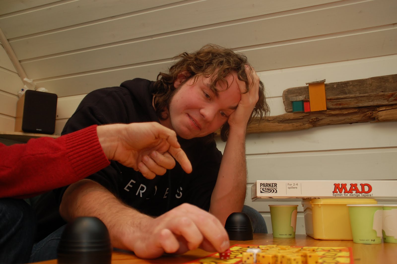 igdeTroll var et langt spill til kortspill å være så Arild fikk bestemme neste spill ut, og det ble den gode gamle klassikeren Bluff. I første budrunde ble stemningen kjapt satt, da Peter sa det var 14 enere rundt bordet. Han ble kjapt sett av Hollender, og mistet dermed alle sine 5 terninger til stor latter fra oss andre. Det tok ikke lang tid før Sveinmain også var uten terninger, så i påvente av en ny runde spilte de likegodt Mr.Jack. De andre fortsatte i kjent stil og Arild hadde en fantastisk runde og hadde 4 terninger igjen mot Hollenders ene. Men han mistet den ene etter den and