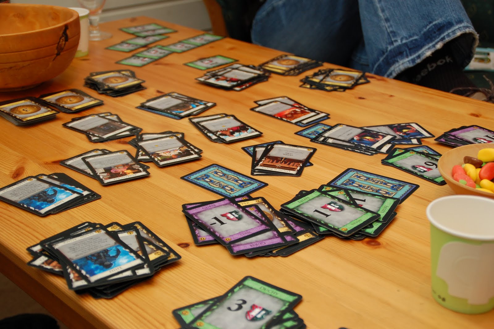 e neste spill. Dominion ble valgt, og de 10 distriktene ble plukket ut helt tilfeldig. Mange morsomme kort ble med denne gangen, som Heks, Militia og tyv. Sveinmain kjøpte tidlig Heks og slengte litt curse til de andre spillerne. Stenmingen var satt og det ble endel curse etterhvert. Da hjalp det at kortet hvor en kunne trashe 4 kort også var med, selvsagt hvis du hadde curse og det kortet samtidig. Alle slet med å få kjøpt dyre kort da det var så mange tyver at folk ikke turde
