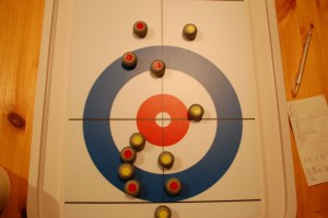 Black ant skulle tidlig opp neste dag, og var klar for å sende oss hjem fra Spill-loftet, men da Table-curl ble nevnt var han ikke sen om å drøye det litt. Vi bestemte oss for å spille 4 runder, med 2 sistestener hver. Som vanlig var det Schengen mot EU. Black ant og Sveinmain åpnet 1. runde med å vinne med 1 poeng uten sistesten. Neste runde hadde de sistesten og vant igjen med ett poeng. Neste runde likeså, mens de cruicet inn seieren i siste runde hvor Black ant kjørte en del stener med curl(ja, det er mulig) og tok en overbevisende 3 poenger i siste runde.