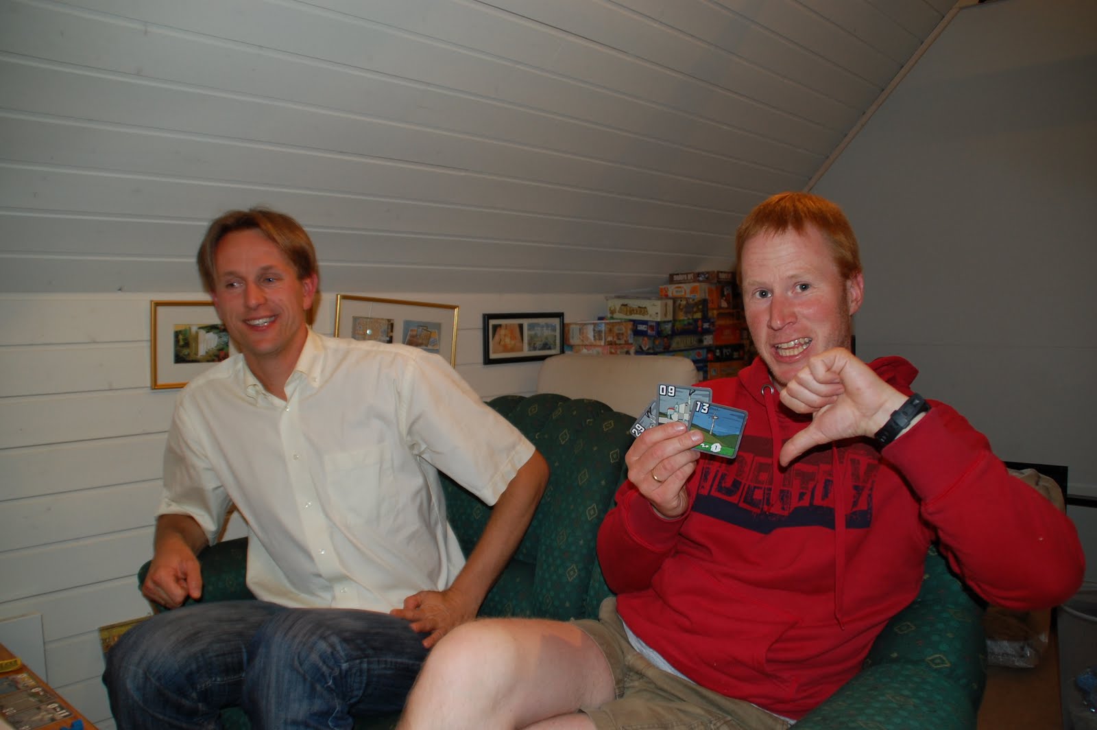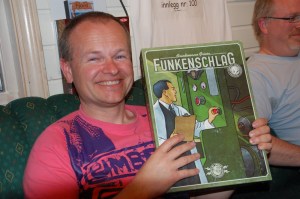 m. Ant var såpass nyskjerrig og fornøyd at plastikken ble sprettet og reglene på 12 språk! ble lest på ett minutt, så var vi igang. Novem var meget vakkert og engasjerende. Er egentlig et spill for 2 spillere, men siden vi var 4 spilte vi 2 og 2 på lag. Gikk kjapt unna på 10 minutt, og dreamteam Ant og Peter vant overlegent foran Sveinmain og Hollender. Alle var godt fornøyde med spillet, som overrasket meget positivt!