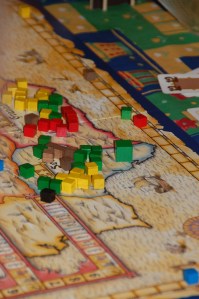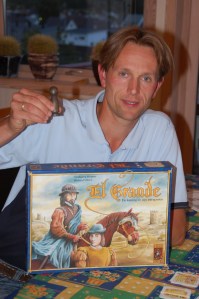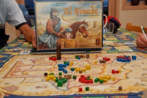Så var alt klart for kveldens hovedrett! Noen prøvde å ødelegge måltidet for andre med å foreslå uspiselige retter som Funkenschalg, men heldigvis kom det noe mye bedre på bordet, nemlig, El Grande, spiele des jahres 1996! Ville det fortsatt duge i år 2010? Noen hadde prøvd det før, andre hadde dårlige opplevelser fra MidWinter med dette spillet, men Hollender gjorde en glimrende jobb med å forklare reglene, så var vi i gang. Mye interraksjon i dette spillet hvor det gjelder å få innflytelse i flest mulig av de 9 områdene av Spania som brettet viser. Disse områdene bør kontrolleres best mulig spesielt i runde 3,6 og 9 når det er poengtelling. Brettet ble etterhvert og med 5 spillere forholdsvis trangt og d