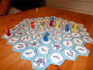 møtt opp til aperitiffen: Black Ant, Arild, og Peter mens Vegard hadde lovt å komme til hovedretten. Hvilken aperitiff kan vel passe bedre en varm sommerkveld enn litt Packeis am Pol-sushi? Packeis am Pol går ut på å med hjelp av pingviner samle så mange fisker som mulig. Med tre personer har en tre pingviner hver. Brettet er en mengde sekskantige isflak som er hopet sammen og der hvert flak kan holde en, to eller tre fisker. Hver gang en flytter sin pingvin har tar spilleren in isflaket den stod på og derved brytes etterhånd isflaket opp. Det blev en knallhard og tett spilling der alle søkte å blokkere hverandres pingviner. Se bilde fra startplasseringene! Black Ant viste seg ha best blikk for dette og la sine røde pingviner systematisk skåre opp isen. Han trengte etterhånd ut Peters gule og Arilds blå pingviner til de mindre fiskerike delene. Blakk Ant avgikk med en nok så velfortjent seier. Men hvem ble sistemann? Etter en nøyaktig telling ble resultet: