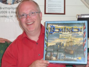 Dominion har jo ikke vært Peters beste gren, men han hadde fått litt gode tips av Hollender om å ikke kjøpe for mange action-kort uten heller satse på å øke kjøpkraften tidlig i spillet. Det som skiller Dominion Seaside fra Dominion er at visse av kortene blir værendes i to turer. Dette gav en interessant vri til spillet. Vi dro ti kort og spilte med ett oppsett der Skattkart, Fyrtårn og Sjøhekse, var de kort som fikk mest betydning. Sjøhekse er et attakkort som gjør at alle motspillere må kaste det øverste kortet i sin høg og legge et forbannelsekort som gir en minuspoeng øverst i høgen. Fyrtårnet er et kort som blir hverende i to runder. Det gir et mynt mer å kjøpe for og i den omgang det legges ut får man også en ekstra handling. Det beskytter dessuten mot attakker. Skattkartene kan, viss man har to av dem, tas ut av spill i utbytte mot fire gullkort (a tre mynter hver).