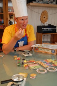 Sveinmain kunne denne kvelden innby til spilling i Grotten med en rikholdig meny. Kokkeluen og forkledet var på plass da årets desidert morsomste brettspill skulle innvies, nemlig A la Carte. Kun 3 mann denne kvelden da nok en PGer(Arild) har forlatt oss for det neste året. Men ingen er slukøret for det, selv om også Peter måtte kaste inn håndkledet denne kvelden. Det var bare å finne frem kokeplatene, sette på steikepannene og begynne å koke de fantastiske retter. I A la Carte gjelder det å være den beste kokken. En må få riktig varme på ovnen, før det vanskeligste, nemlig å krydre rettene riktig. 4 ulike sorter krydder skulle ristes opp i pannen, noe Hollender slet voldsomt med å få til. Han hadde alt eller ingen prinsippet, og fikk frem gode latteranfall hos oss alle, inkludert han selv. Det ble en del overkrydrete retter på han som måtte kastes i bøtta før han prøvde seg på nye utfordringer som stort sett gikk samme veien. Sveinmain klarte å lage cafe ala fidel, sprengt Calzone alle nøyaktig etter oppskriften. Dette gir stjerner og første mann til 3 stjerner er master chief. Ant prøvde seg på pannekaka. Den har spesielle regler, og må selvsagt kastes opp i lufta for å snus. Det er enklere sagt enn gjort, og selvsagt en festlig kuriositet i ett allerede morsomt spill. Sveinmain klarte å snu sin pannekake før den ble brent og dermed var han Master Chief.