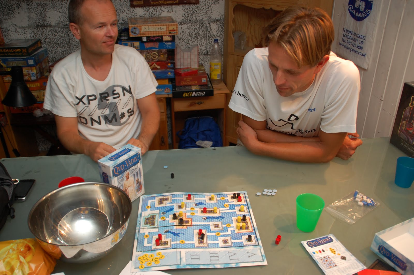 Sveinmain hadde også forberedt en annen nykommer i PG denne kvelden. Ordet forhandlingsspill fikk både Black ant og Hollender til å grøsse på ryggen. Im the boss sitter fortsatt i ryggmargen! Denne gangen var det Knizias Quo vadis? som skulle testes ut. Her gjelder det å forhandle seg frem gjennom de ulike komiteene i Ceasars regjering, og ende opp på toppen sammen Ceacar. Kom du deg ikke dit var du ute. På veien gjaldt det å samle poeng. Det ble en del avtaler og hestehandler i løpet av spillet, men alle gikk rolig og greit for seg. En hadde kontroll over mye, men kunne kjøre seg fast hvis en ikke ville både gi og ta. Alle samlet en del poeng, men etter at senatet til Ceacar var fyllt var det fintelling, og Hollender hadde samlet mest innflytelse.