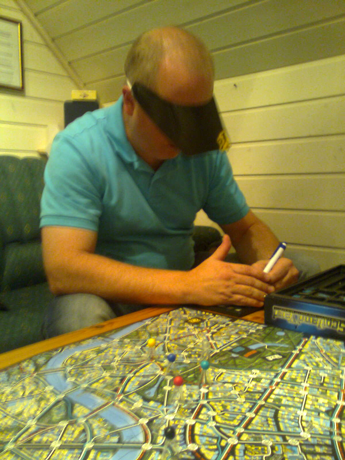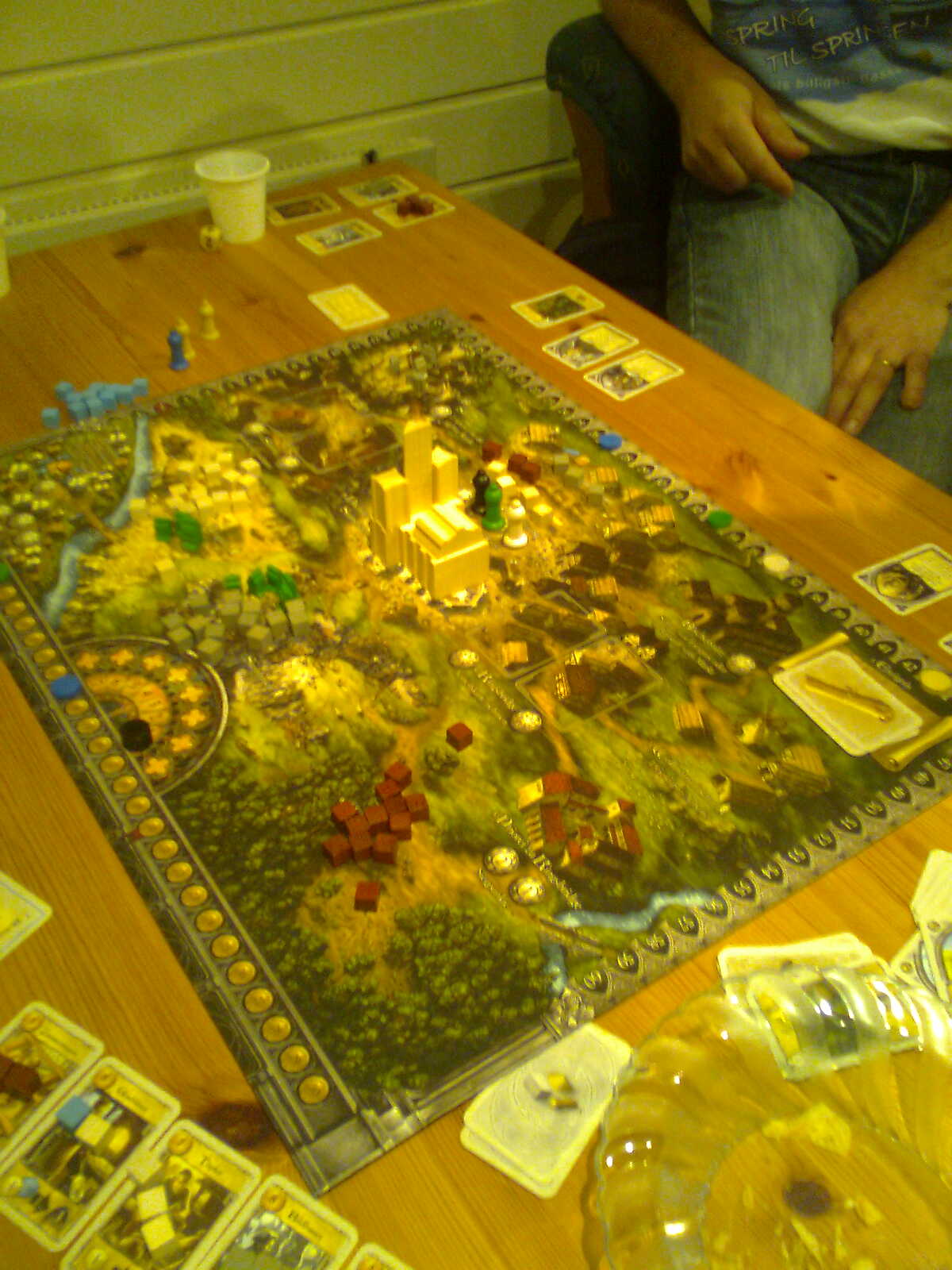 4 glade gutter hadde møtt opp på spill-loftet denne mandagen. Ikke mer å forvente når det var hele 7 spillere forrige gang. Black ant var kjapt fremme med å foreslå Stormenes tid som kveldens spill. I kjent Black ant stil er viljen til å spille spill større enn kunnskapen om selve spillet, og reglene satt såpass rustent, og kaoset i eska var såpass stor at vi var nære ved å gi opp. Men vi ble reddet av at utvidelseskortene var nok trykket på et annet trykkeri enn orginalen, så fargenyansen reddet oss, og vi fikk skilt klinten fra hveten. Så var det bare å sette igang. Black ant fikk første brikke opp av posen, og dermed fikk han kjøpt Prior Phillip i første runde noe som gav han ett ekstra seierspoeng for hver byggmester som ble satt i borggården. Han opparbeidet seg på den måten en solid ledelse og scoret 6 og 7 poeng mens vi andre scoret 3-4. Sveinmain prøvde trikset å utrope han som vinner tidlig, mens Peter prøvde det han kunne for å få Idar og Sveinmain til å ofre seg å okkupere plassene i borggården så ikke Ant fikk de. Litt for sent kom Knut Magne innom og fikk sitt første, og forhåpentligvis ikke siste møte med PG. Han fikk i tillegg til å assistere Idar, æren av å bygge katedralen runde for runde. Stormenes tid er et morsomt spill hvor poengene øker i takt med rundene, og det ble det også denne gangen. Sveinmain klarte å samle opp litt metall, og kunne gjennom glassblåseren hente viktige poeng, og spiste sakte men sikkert inn Black ants forsprang. Siste runde kom og Peter scoret hele 17 poeng. Idar svarte med å ha mynthandleren og fikk en 12-13 poeng. Ant som ledet fikk bare 8 og dermed kunne Sveinmain meget fornøyd innkassere seieren, da han sjelden vinner slike «tyngre» spill.![]() |