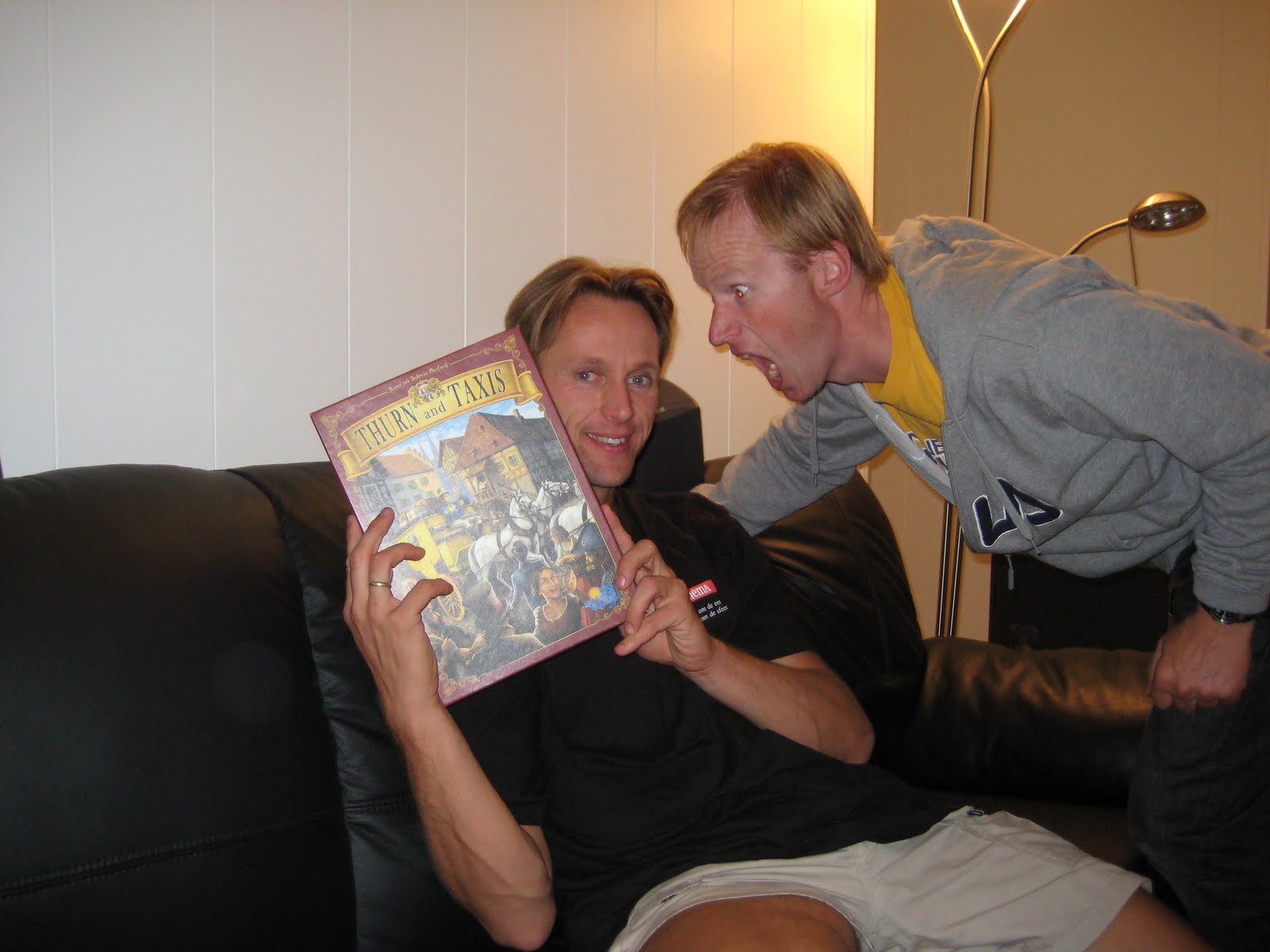 Når runden var over dukket Svein opp på døren for å slå av en prat og med en bag med spill (bytte varer). Peter dukket også opp etter lit leting etter spilllokalet. Vi ble enige om, siden vi nå hadde funnet ut vi spillte litt feil første runde, å ta en runde Thurn and Taxis.