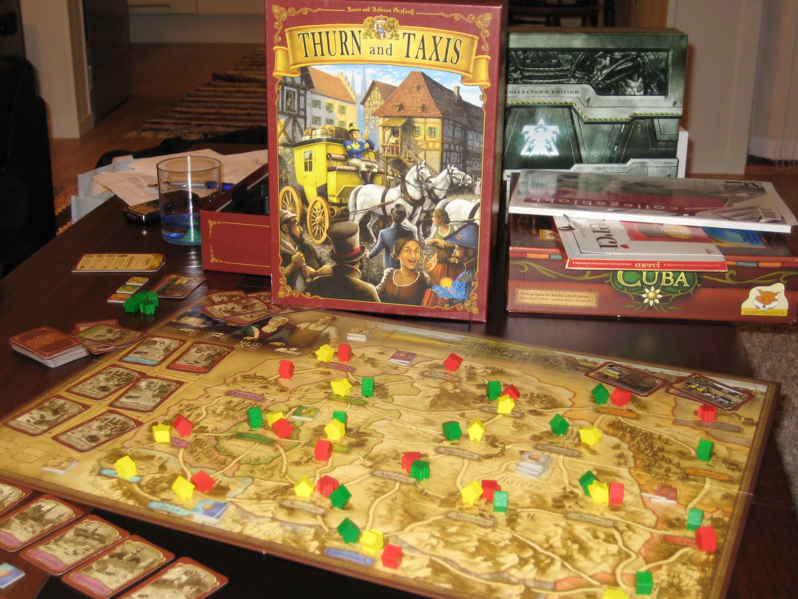 Spillet Thurn and Taxis var et nytt spill for meg, og ikke spilt så mye av Hollender så det måtte en regellesing før spillet kunne starte. Etter en rask regelforklaring, startet jeg etter reglene som yngste spiller. Målet i spillet er å sette opp postruter i Bayern og omliggende distrikt. Man må sette opp korte ruter før en gradvis bygge seg opp, slik at man minst lager 5 post ruter hver, hvis alle klarer det? Jo lengre ruter jo vanskeligere blir det også på grunn av at man vil skaffe seg regionspoeng når regionene begynner å fylle seg opp. Spillet er litt statisk i begynnelsen men trenger mer planlegging utover i spillet. Hollender kom raskt igang og stakk av med alle de lengste rutene først og fikk igjen mer poeng for det. Jeg selv slet litt med kortene som kom opp og brukte mange handlinger på å bytte kort. Men fikk sanket en del regionspoeng istedenfor.