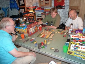 Så var det en liten presentasjon av årets Math-trade spill til stor jubel fra deltakerne. Øverst på ikke savnet listen sto både Im the boss og Jamaica, så da gjorde det lite at nykommerne var 1. utgaven av Neuland og ikke minst Dominion Prosperity! Black ant ble såpass henrykt at han likegodt sprang hjem og hentet grunnsettet, for dette måtte testes. I mellomtiden ble det gjort klart til Il Principe, et spill fra middelalderens Italia, hvor innflytelse og auksjon står i høysetet. Her gjalt det å spille kort, by på de ulike kortene, bygge by hvis du klarer og som gir poeng, og skaffe seg innflytelse som igjen gir poeng og fordeler. Det ble en tett omgang som tok litt tid da reglene satt rustent da det var et år siden forrige gjennomspilling. Men etterhvert satt det som det skulle helt til slutten. Kortstokken gikk tom, og dermed ble pengeutbetalingsrunden skippet. Alle var bankerott bortsett fra Sveinmain, og dermed kunne han enkelt vinne 3 av 5 auksjoner, med dertil poeng og innflytelse. Blir nok neppe såpass enkelt neste gang….
