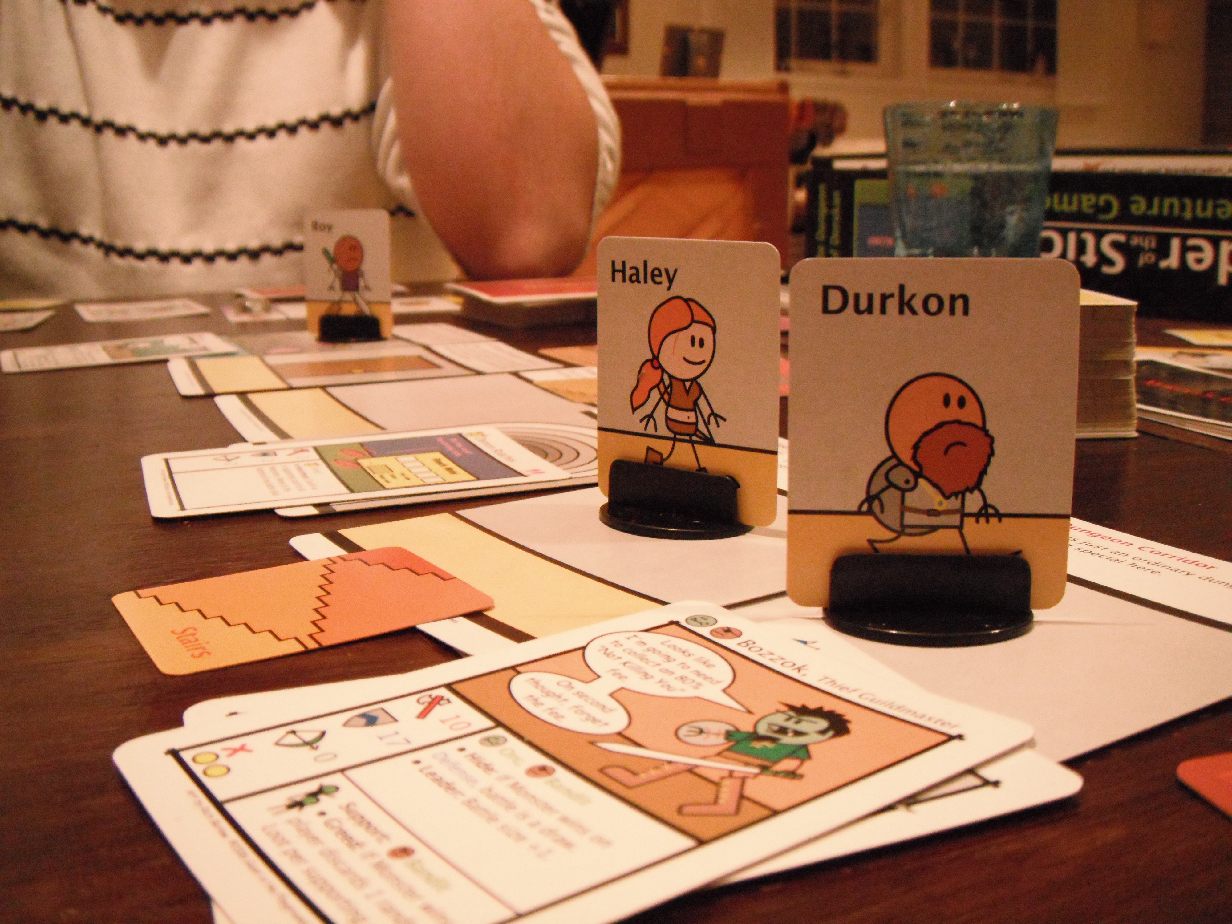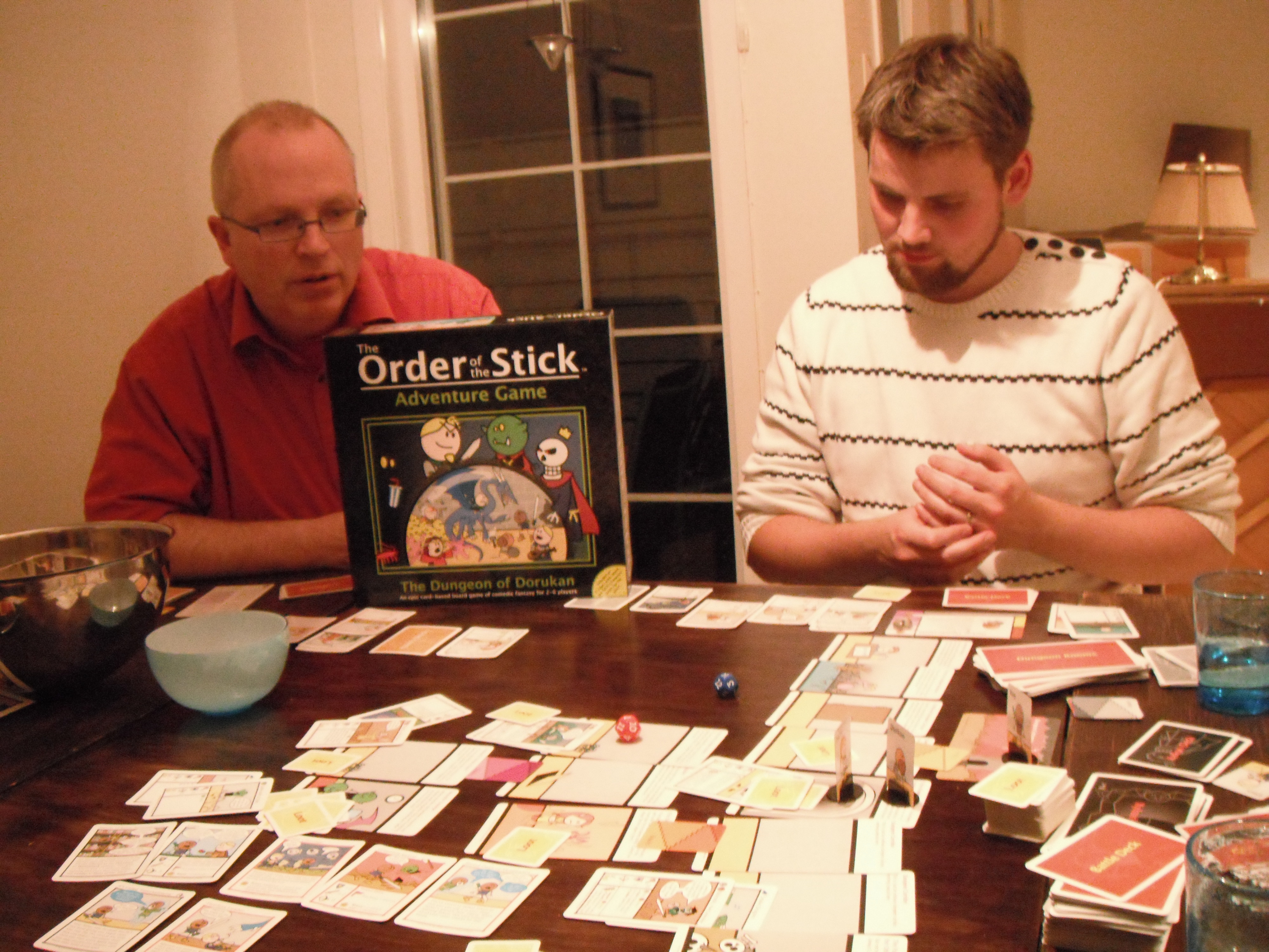 Så var det duket for kveldens hovedrett: Order of the Stick, bygd på en tegneserie av samme navn. Her skulle 3 helter gå ned i en gruve i 4 etasjer og bekjempe monstre. Klarte en det fikk en litt drahjelp til å bli en enda bedre monsterbekjemper. Ble en del terningtrilling i slike spill som det bruker å være, men vi 3 heltene holdt motet oppe og kjempet og kjempet. Flotte illustrasjoner og tøffe monstre gjorde jobben vanskelig, selv med iherdig innsats. Men vi gav oss ikke før André ble kalt hjem av kona. Da hadde 3 timer fløyet av gårde og selv med et siste heroisk slag klarte vi aldri å nå sluttmønsteret. Men neste gang, da skal vi vinne….