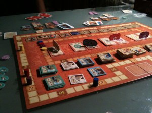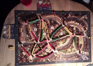 er og en har fått kunder i begge ender er det telling. Antall handlinger varierer fra 2 til 4 og både Innante og Kjell Bjørn kom kjapt inn i det, så det var bare å gi jernet. Kjell Bjørn kjørte noen egne strategier og bygde i et område med fattige kunder, men likevel etter å ha spilt ut klokke-brikken som konsoliderer området så kunne han innkassere hele 44 poeng. Innante og Sveinmain trodde løpet var kjørt, men de klarte å kjempe seg inn på slutten. Sveinmain og Innante gikk stort sett samme vei, og det gjorde at Sveinmain fikk servitør-rollen og Innante kunne score billige poeng etterpå. Dermed stakk Innante av med seieren igjen. 1. Innante 138 2. Sveinmain 116 3. Kjell Bjørn 111.