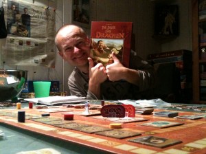In the Year of the Dragon er et spill hvor man ikke har råd til å gjøre feil. Det finnes ingen snarveier for å innhente seg om man først gjør feilgrep. Black Ant visste hva han skulle gjøre fra starten: kjøpe privilegiet i runde 1 som gir 24 poeng til sammen. I tillegg satset han på bokstrategien som i kombinasjon med tidlig inntjente penger på hånd, gav han sikre 8 poeng de siste 5 rundene. Peter satset også på denne strategien, men han gikk merkelig nok tom for penger og kunne så ikke kjøpe seg til poeng. Dermed ble det bråstopp for ham de siste rundene. Hollender som hadde brukt de viktige personkort (doblingskortene) de første rundene for å redusere skaden (på mat og penger), klarte likevel å innhente Peter med en sammenhengende plan de siste fem rundene. Nybegynnere har stor ulempe mot erfarne spillere (som lett kan spille på autopiloten) her. Om man derimot spiller med bare erfarne spillere er dette et spill som virkelig kan bli bra. Med åpne kort og mulighet til å se hele forløpet i spillet er det flotte muligheter for å bruke list og taktisk spill for å vinne. Likevel ser det ut at bokstrategien er et av de sterkeste kortene i dette interessante spillet. 1. Black Ant 103 2. Hollender 89 3. Peter 85 4. Takras 56