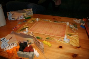 Takras, Saulius og Hollender spilte Medina. Her dreier det seg om å bygge opp den forfalne ørkenbyen med nye palasser. Alle spillere starter med de samme spillbrikkene som holdes skjult bak en skjerm. Hver tur kan man sette ut to brikker. Så oppstår det palasser som kan okkuperes av spillerne når de setter et tak på disse. Palassene kan få ekstra poeng når de grenser til gater med torgboder eller bymuren. I tillegg kan man få poeng når man har de største palassene i en farge eller når man knyttter et eget palass til en bymur. Hollender okkuperte snart noen palasser som grenset til torgbodene. Takras fikk noen store palasser i hjørnene, men Saulius hadde noen store palasser som gav ham noen bonuspoeng. Etter 45 minutter var brettet godt fylt med flotte byggverk. Alle følte nok at Hollender hadde flest poeng, men tellingen viste at det ikke var så mye forskjell likevel.