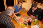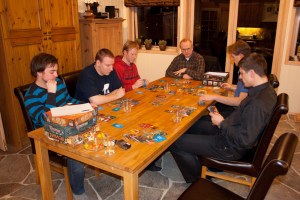 Når Takras snakker om Vikings så må det jo brettes ut på bordet. De mektige vikingbrikkene ligger i posen i avvente av å bli plukket ut. Takras prøvde så godt han kunne å forklare reglene, men bråkmakerne ved Leeuwenhartbordet snakket så høyt at det var vanskelig å høre seg selv tenke! Snakker om god stemning rundt krigsbordet. Vikingene fikk etter hvert lov til å komme til ordet, men Vikings er faktisk et spill som lar seg best forklare av å spille en runde. Har man tidligere spilt med et Rondel-hjul og Carcassonne er det kjapt å komme inn i disse aspektene av reglene. Første runde var i gang, og Pift og Vegard tok reglene til seg etter den første runden.