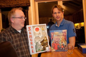 Årets første bursdagsfeiring fant sted i Holland House onsdag den 2.februar. Hele 7 spillere møtte opp. Bursdager i PG blir markert med mye spilling. Hollender hadde satt klart et tre meter langt bord, som ble delt inn i to spillsegmenter. Tre spillere startet med Tobago (les senere), mens Peter, Saulius og Hollender startet med Samurai. Det kjappe og svært taktiske spillet ble en ren sjakk-kamp. Innflytelsesbrikker blir plassert strategisk, men poengene tjenes mest med kortsiktige trekk. Før det er din tur har situasjonen på brettet endret seg så mye, at man ikke kan planlegge så mye langsiktig. Det er hjelmer, buddaer og rismarker å få. Man må ha flertall i en sort for å kunne vinne. De erobrete brikkene samles bak en skjerm, slik at de blir utfordrende å vite hva den enkelte har fått. Hollender satset på majoritet i rismarker. Sauilius og Peter prøvde å få flere brikker samtidig, men situasjonen på brettet ble stadig trangere og kampene om lukrative plasser hardere. Til slutt var det ingen som visste hvem som hadde vunnet. Hollender hadde sikret rismarker, Peter hadde 5 hjelmer, Saulius delte flertall i buddaer med Peter. Peter og Hollender kunne nå telle de andre brikkene som gav dem poeng. Peter hadde mest og ble kvelden samurai.