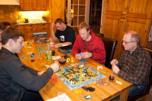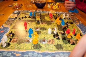 Endelig, endelig skulle Domaine, eller Leeuwenhart som det også heter komme på bordet. Da alternativet sto mellom Vikings på den ene siden og dette på det andre valgte Saulius det ukjente fremfor det trygge, og de andre var ikke vanskelig å be i dette fantastiske spillet. Alle plasserer ut 3 slott hver på brettet, og skal ved hjelp av riddere forsvare og avgrense området sitt, og få seierspoeng for det en kontrollerer. Brettet er litt trangt, så det er mye dueller på brettet på en gang. Sveinmain klarte å lage seg et stort område da ingen ville bygge i nærheten av han, men på bekostning av dette måtte han la sine andre slott seile sin egen sjø.