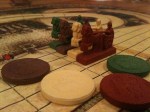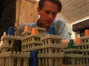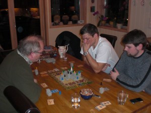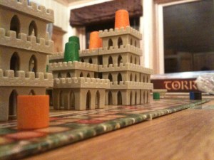 Takras hadde kommet rett fra en lang arbeidsdag, men hadde lyst til å spille noen timer likevel. Med mange taktikere rundt bordet, var Torres neste spill. Her skal man bygge tårn/slott og plassere ridderne sine på de beste plassene. Hver tur har man 5 actionpoints som man kan bruke til ulike handlinger. Selv om spillet er forholdsvis enkelt, er det en del regler å huske. Det er tre runder som ender med en telling. Saulius reduserte tidlig Hollenders borg i et hjørne, slik at denne ikke kunne utvides som Hollender hadde tenkt seg. Peter prøvde tidlig å fordele sine riddere på brettet. Takras sikret høyest posisjon i en stor borg. Peter forsøkte å komme opp i høyden, men ble stoppet av Takras som plasserte en ridder strategisk. Saulius skjermet sin «egen» borg og kongen. Hollender kom takket være et action-card inn i Takras’ store borg og inntok etter hvert den høyeste posisjonen her. Han ledet etter den første tellingen, men forskjellene var små. Saulius ble startspiller og plasserte kongen i sin egen borg. Hollender klarte å holde de høyeste posisjonene alene, slik at det ble mye taktisk plassering av riddere for å hindre andre til høyere nivåer.