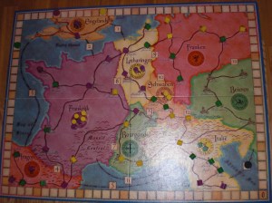 Noen har bedre tid enn andre, og for noen er det attraktivere å bruke tiden på brettspill enn å se på kjedelige landskamper. Takras satt fortsatt på fergen, da Peter, Saulius og Hollender tok en omkamp i Kardinaal & Koning. Hollender var startspiller og åpnet Lotharingen. Saulius og Peter visste hvem de måtte passe på og låste temmelig fort både Sachsen og Schwaben. Hollender klarte å sikre en en liten rekke og tok flertallet i Frankrike. Den første tellingen kom etter kort tid og Saulius og Peter hadde flest poeng i provinsene. Hollender 5 poeng for en liten rekke, holdt ham i tetkampen. Kongene ble nå flittig plassert og særlig Peter hadde kortene han trengte. Han plasserte hele 4 konger i Frankrike (Hollender og Saulius fikk ikke Frankrikekort) og avsluttet spillet like før Hollender hadde endleig muligheten til å komme på høyden med Peter i Frankrike. Peter var den eneste som fikk poeng for lukrative Franmrike-Italia, men vant ikke så stort som alle hadde ventet. 1.Peter 61 2.Hollender 55 3.Saulius 46