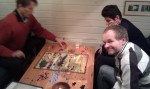 Til slutt kunne vi samle oss om en behagelig dessert, Figaro. Her gjelder det å spille kort på den motstanderen du vil, og dermed en høy sabotasjefaktor. En så raskt hvem som hadde vunnet de foregående spillene og det tok ikke lang tid før Hollender og Sveinmain hadde trukket inn hver sin bunke. Etter dette så jevnet det seg en del ut. En spiller 3 runder, og vi så at fordelen med å vinne siste runde var såpass stor denne gangen at sisterundevinneren ville vinne hele greia. Peter snakket minst, tiltrakk seg minst oppmerksomhet og fikk dermed minst kort spilt på seg. Dermed fikk han spise middag med kongen, mens vi andre måtte underholde han under middagen.