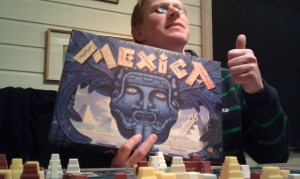 Peter startet det hele med å bygge feil, men heldigvis oppdaget vi det og kunne starte på nytt. Forholdsvis enkle regler i Mexica og et regelskjema som forteller det meste. Peter grunnla en 12 ruters by og scoret poeng, Saulius fulgte opp med en 11 ruters, mens Sveinmain som 3. mann ut klarte den 3. største. Dermed var vi godt i gang og det ble mye pyramidebygging i disse byene for å få mest innflytelse og dermed flest poeng i byene. Det ble mye taktikkeri, men lite analyse paralyse tross 6 mulige handlinger underveis pr. person pr. tur. Sveinmain klarte å avslutte runde 1, med å sette sin brikke på helligdommen i midten, og scoret 5 viktige poeng på dette. Peter fikk æren av å starte 2. runde og laget kjapt den største byen og viktige poeng. Det ble mye kniving om de beste byene i 2. runde, spesielt byen som var laget og ikke grunnlagt som kunne gi hele 14 poeng. Sveinmain hadde et hus der, men Peter viste kløkt og isolerte bygget, og dermed var Sveinmains hus verdt kun den plassen det sto, nemlig 1 poeng. Peter bygget mange 3 og 4 etasjes pyramider, men i all storheten glemte han å flytte brikken sin ut igjen på brua som førte inn i området. Saulius så situasjonen og tok bro-plassen, og dermed var Peter isolert i en by han allerede hadde flertall i. Dette ble Peters bane til slutt, og dermed ble Sveinmain kongen av Mexica denne mandagen, mens Saulius gjorde rimelig skarpt til en førstereisgutt å være.