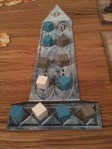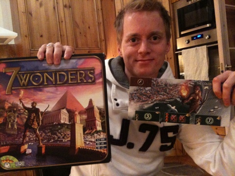 Apropos favoritter, så havnet 7 Wonders på bordet enda en gang! Devaliant hadde lest om det i bloggen vår og sett Takras’ video, og hadde gledet seg til å prøve ut dette. Å vite hva man skal samle på og ikke er ikke alltid lett, og Devaliant fikk virkelig prøvd ut dette. De blå kortene er enkle å forstå, siden de forteller deg med en gang hvor mange poeng de er verd. De grønne kortene er helt umulig å vite hva er for nybegynnere, så disse lot han gå forbi. Takras samlet godt på disse, i håp om at det skulle være nok poeng. Hollender hadde tenkt ut en ny strategi denne gangen, men han følte ikke det bar de fruktene han hadde forventet.