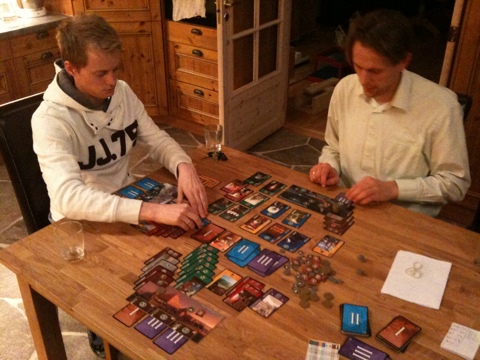 Første runde gikk smertefritt, og alle hadde nok ressurser sammenlagt til å bygge det de ville. Neste runde var vanskeligere, og det var ikke lett å vite hvilken vei man skulle ta. Devaliant satset på militærmakt, for det hadde han lest i bloggen vår at kunne være en god strategi for 3 spillere. Og det viste seg å være det. Helt på slutten fikk han kjøpt seg et 8-poengskort om krevde alle ressurser, og han fikk akkurat nok til dette runden før da Takras kjøpte tømmer av ham. En siste poengtelling, og Hollenders taktikk hadde virkelig slått feil. Devaliant fikk det han ville, og vant på militærmakt.