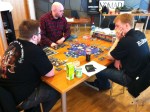 Emil fra Harstad hadde fra dag én av spilt Chaos of the old World, og spilt det allerede fire ganger siden torsdag. Takras takket ja til invitasjonen denne gangen, og fikk opplæring sammen med to andre nye spillere. I dette spillet er man altså onde. Det handler om å korrumpere landsdeler og ødelegge landene fysisk. Men det er selvsagt ikke smertefritt, for med fire spillere er det fire makter som ønsker dominans. Det som er interessant her er måten hver spiller må spille på. Det er fire fraksjoner, og alle får sine seierspoeng på forskjellige måter. De røde må drepe noen i så mange land de kan hver runde, mens de lilla må korrumpere med minst to poeng i land der visse bonusbrikker ligger. Blå og grønn har igjen sine måter å få poeng på. Og det går an å avslutte spillet på flere måter, enten ved at en spiller ha gjort sine seierspoeng helt riktig fra starten av, eller med poengberegning, eller ved at spillet vinner over spillerne. Det var meget interessant, men det er tydelig at det å ha litt kunnskap om verdenen spillet er basert på, hjelper til. Det tok tre timer å pløye gjennom, tre kjekke timer. Sveinmain tok en runde London med Terje, Saulius og Einar som igjen introduserte spillet på mesterlig måte. Sveinmain som vanligvis er skeptisk til Wallecespill, måtte denne gangen la seg facinere. Her var det enkle men gode funksjoner, vakre kort og ikke for lang tenketid. Ta en by, bygg byen, kjør byen det var hovedelementene. Det ble en tett duell, hvor Sveinmain overraskende trakk det lengste strået 4 poeng foran Einar. Da måtte Takras og Saulius kapitulere for denne gangens MidWinter.
